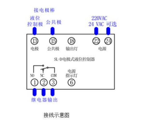 電極式液位開關控制器常見原理:電極式液位開關控制器是利用液體之導電性來偵測液位高低。桶槽內裝的物質一旦觸及極棒,便會導電因而檢出信號。經控制器的信號放大后,再輸出一接點信號,供使用者做液位的控制。